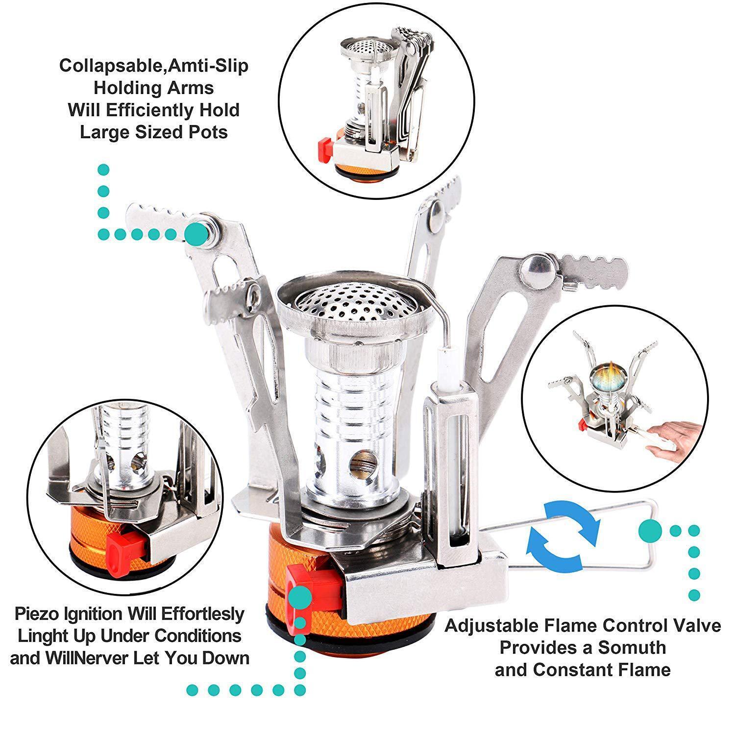 - Foldable handles on pot or stove can be folded to save space. Small size and portable, all the objects in this cooking set can be stored together in a mesh bag for convenient carry.