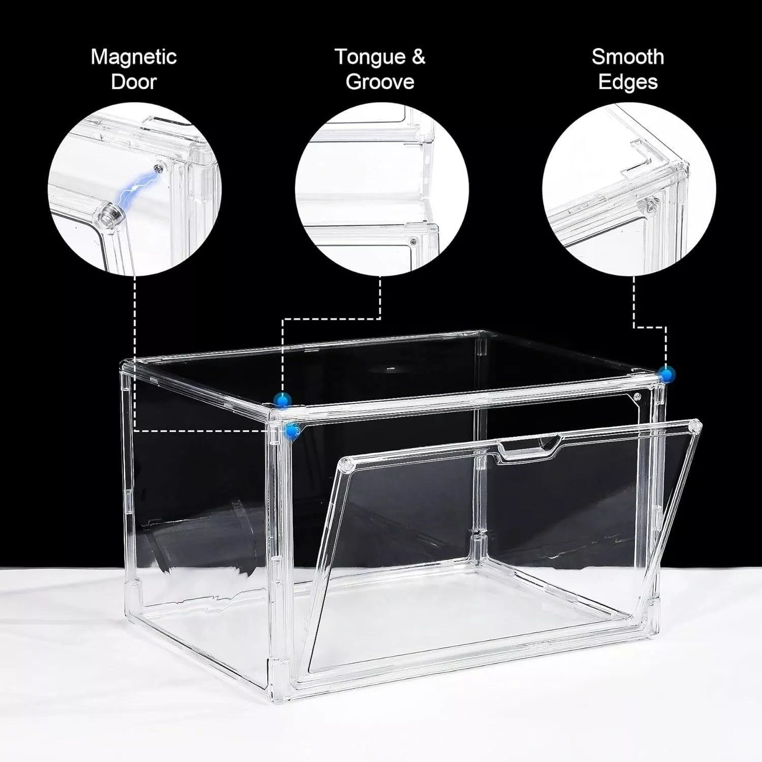 - 【Stackable and Magnetic Door Design】Our display shoe containers is easily assembled with simple interlocking design that makes each shoe storage box be stacked together throuth the concavity at the top which is convenient to be freely superimposed.Its upgraded magnetic door has a handle and two small magnet that provides suction when the door closes.