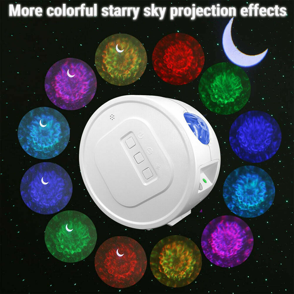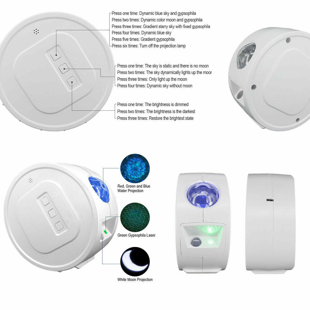 - 3 in 1 Projector : projects 7 color realistic water patterns, moon and stars onto the room ceiling , and fills your room with nebula and moonlight. Creating atmosphere and relieve sleep and stimulating children's interest in astronomy. Auto color-change/single-color mode/moon star mode Option.