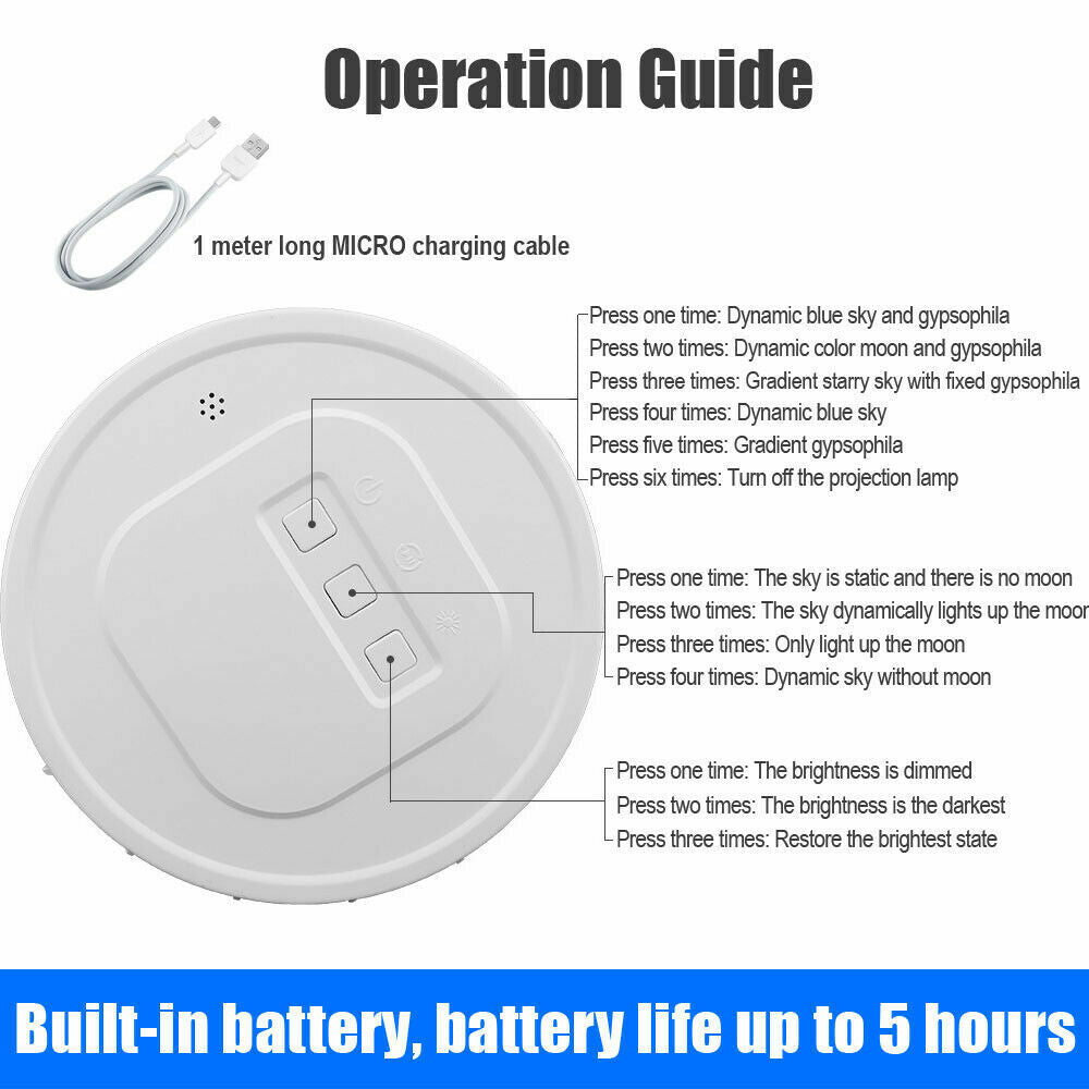 (1) Press once:move the blue sky and gradient starlight.(2) Press twice: move the colored moon andgradient starlight. (3) Press 3 times: gradually changingblue sky and stable gradient starlight.(4) Press 4 times: move the blue sky.(5) Press 5 times: gradient starlight.(6) Press 6 times: to close the light projector.Then recycle.