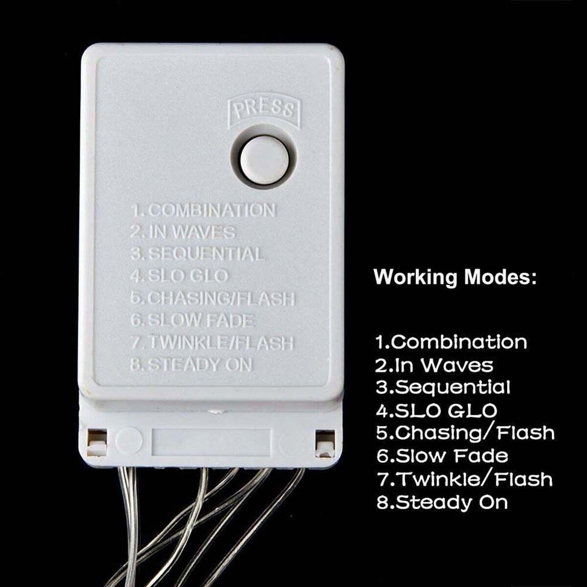 - Every string has 8 different modes: combination, in waves, sequential, SLO GLO, chasing/flash, slow fade,twinkle/flash, and steady on