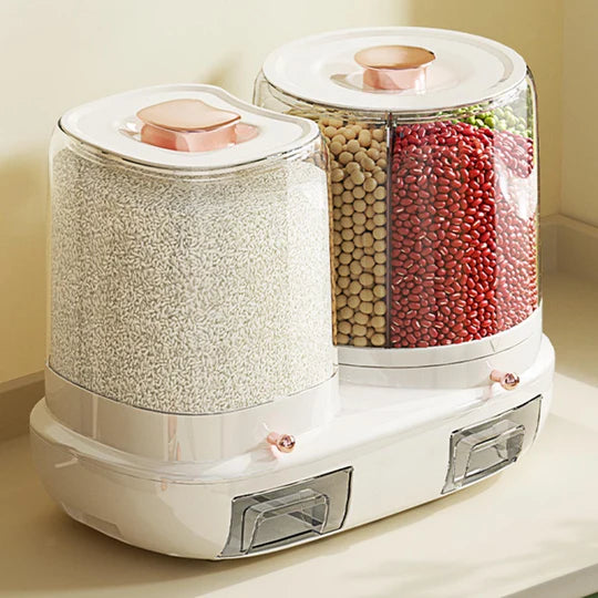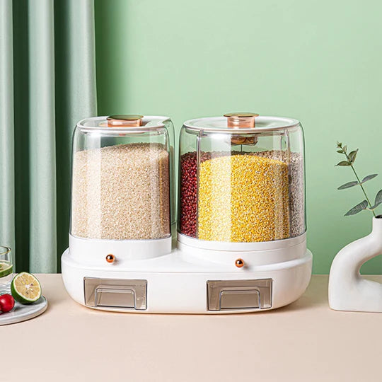360-degree rotation-  The grain dispenser rotates 360�, making it one step faster to take out the grains, one turn easily, and the grains on the inside can be quickly taken out. Independent double rice bucket, separate rice taking without interference, with drawer-type rice taking box, easy to receive rice without scattering. Spiral out of rice, every meal is fresh, funnel-type inner cavity, first use first, no accumulation of old rice.