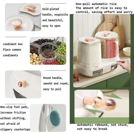 Convenient rice output - The button design of the rice storage box, the golden button, the rice will be automatically output with one pull, and the amount of rice can be easily controlled, saving effort and worry. Automatic rebound, smooth grain output without jamming, not easy to be damaged, and can be used for a long time.