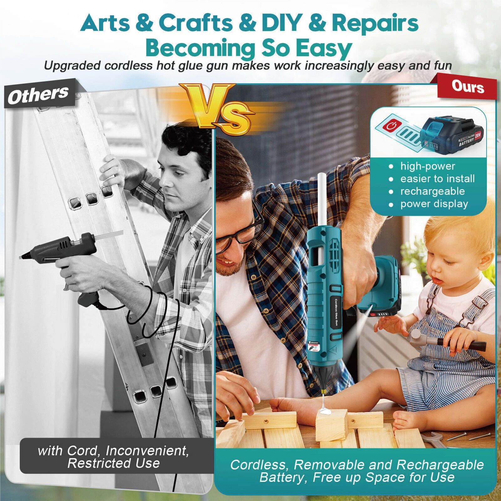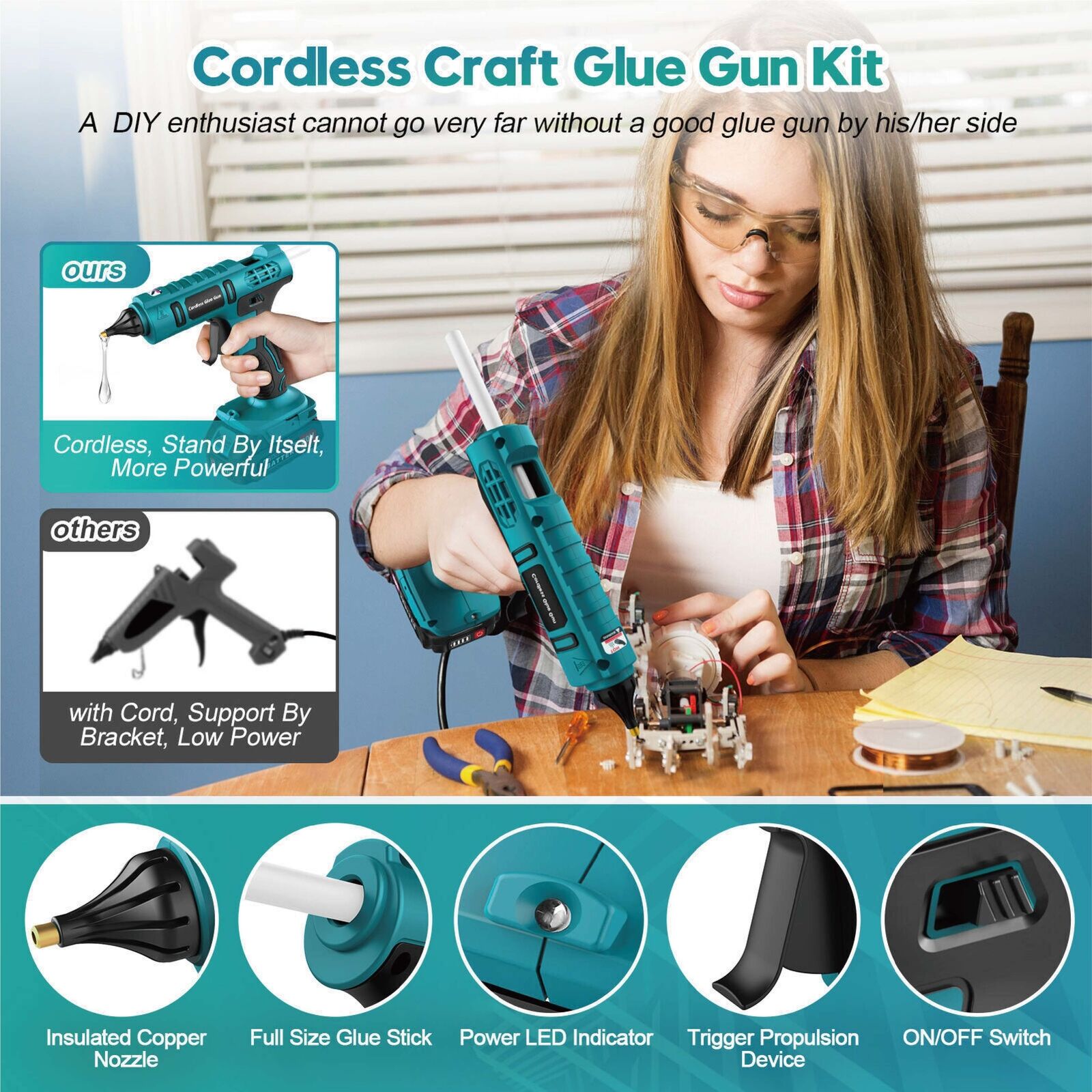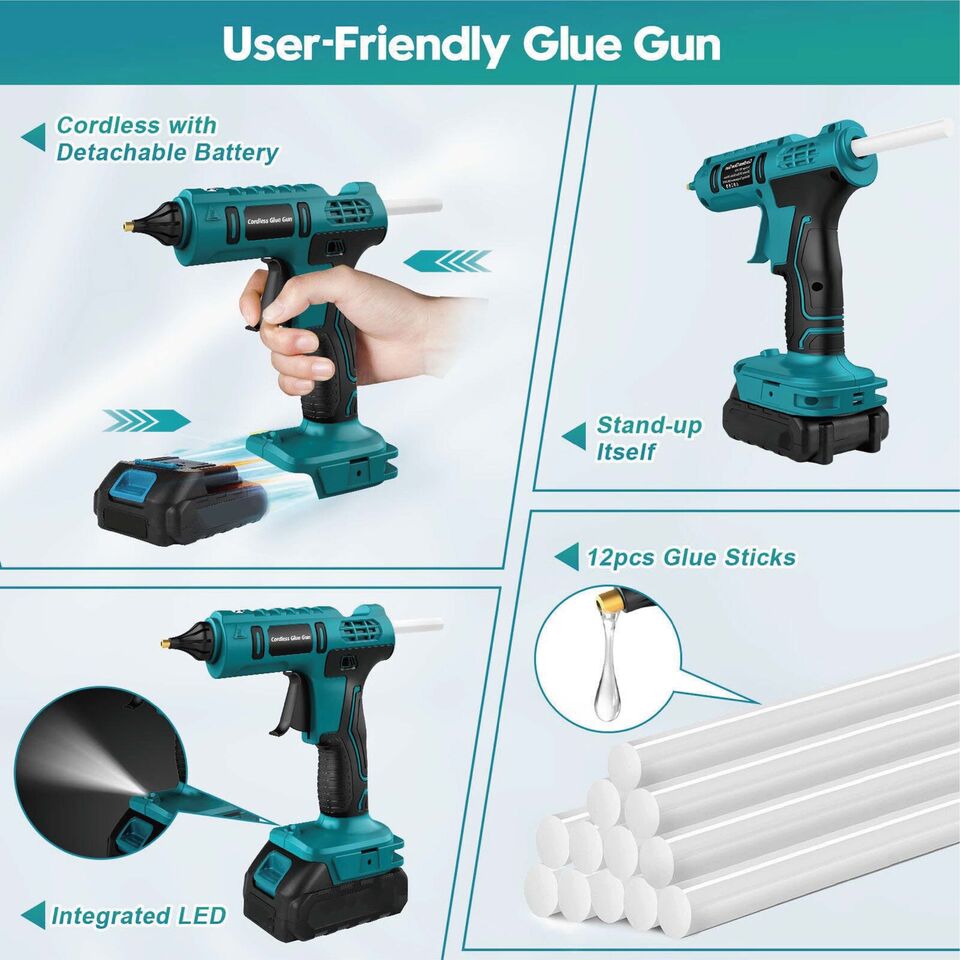 - The Newest Glue Gun for Crafting and Construction - A DIY enthusiast cannot go very far without a professional hot glue gun kit by his/her side. The 2023 newest glue gun has the characteristics of high temp, fast preheating & fast discharging of glue, precision nozzle, easy and large squeeze trigger, enhanced safety features, stand-in self, equipped with long-lasting battery. We are confident that this hot glue gun cordless can meet your Arts & Crafts & DIY & Heavy Duty & Construction needs.