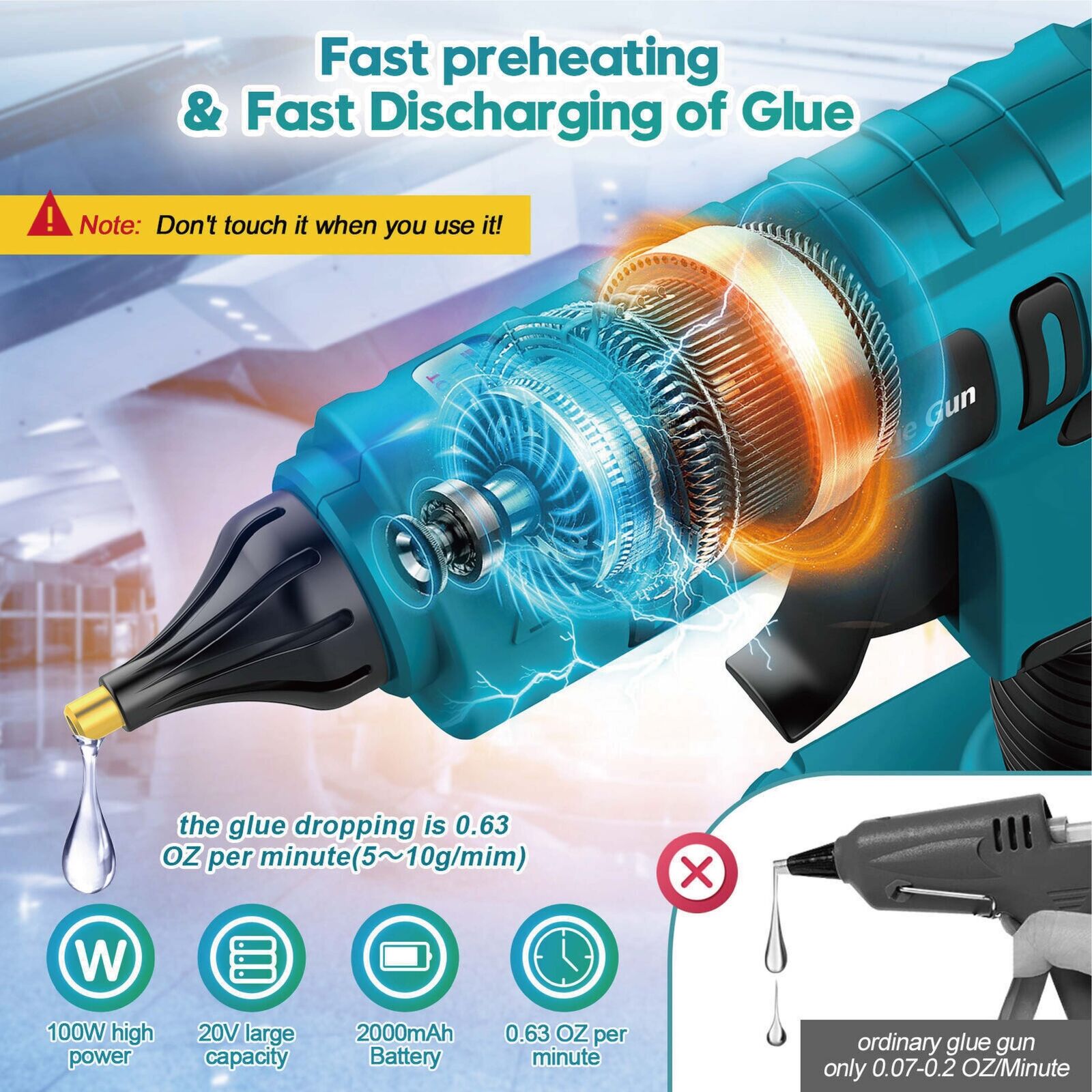 - Fast Smooth Discharging of Glue - This battery powered hot glue gun kit has 100W power for faster and smoother use. craft glue guns dispenses 0.63 oz/min with more uniform glue output and strong adhesion. compared with 0.07 - 0.2oz for a normal low heat glue gun. The cordless glue gun also features insulated nozzle anti-drip fine-tip design, effectively reducing glue spillage, and can efficiently decrease 15% of the glue waste, saving more glue sticks, and keeping your work area clean.