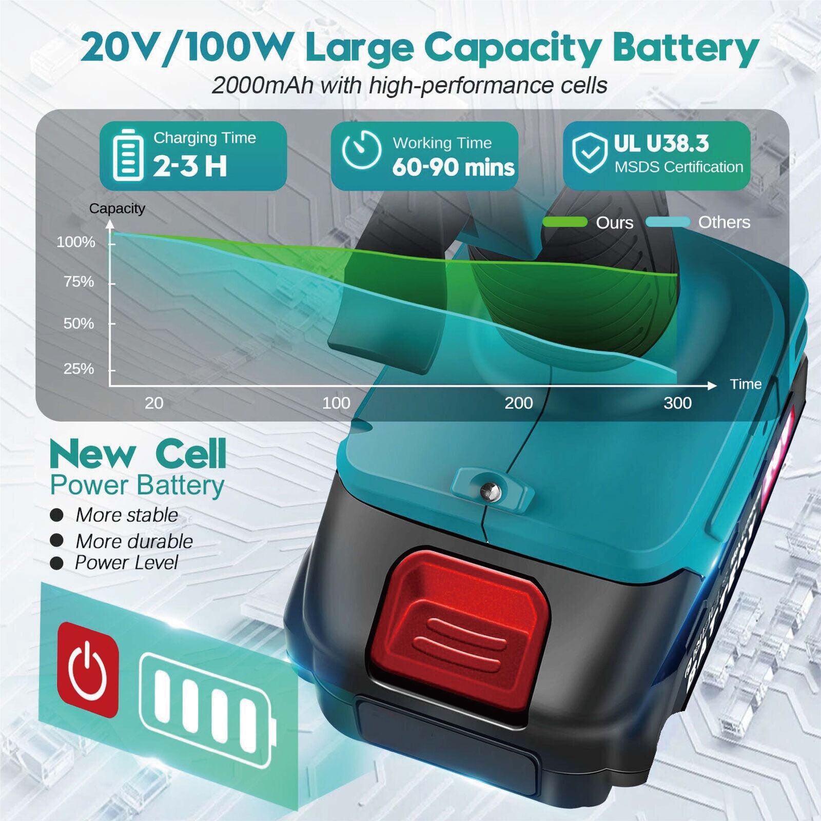 - 2Ah Long-Lasting Battery - Our cordless glue gun rechargeable is powered by a 2Ah lithium-ion battery. The cordless hot glue gun kit with battery and charger supports up to 90 minutes of work after a full charge. which exceeds 97% hot glue gun! Equipped with a fast charger, it only takes 2 hours to fully charge the battery. There is a power display on the battery, power display helps you check the remaining battery power at any time. Let you master the working status of the electric glue gun.