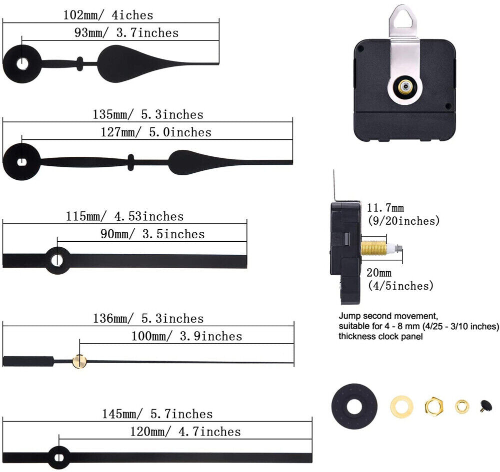- Clock mechanism size: total shaft length is 20 mm (4/ 5 inch), thread length is 11.7 mm (9/ 20 inch); Jump second movement, suitable for 4 - 8 mm (4/ 25 - 3/ 10 inch) thickness clock panel