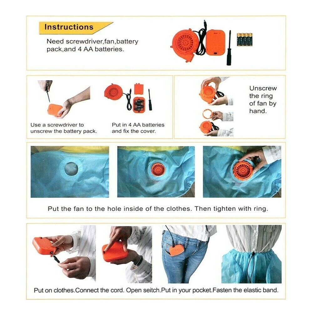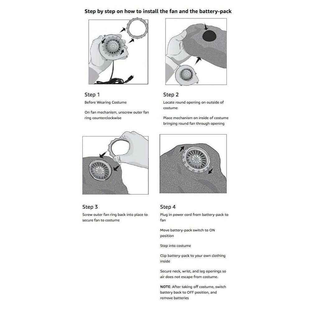 - Simply step inside the costume and click your battery belt clip to turn on the fan. Once zipped up, the costume inflates in seconds.