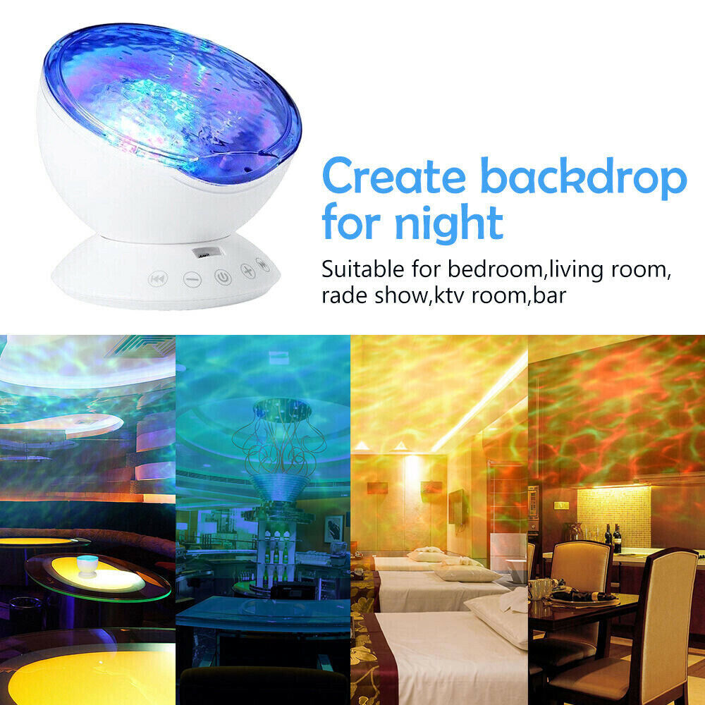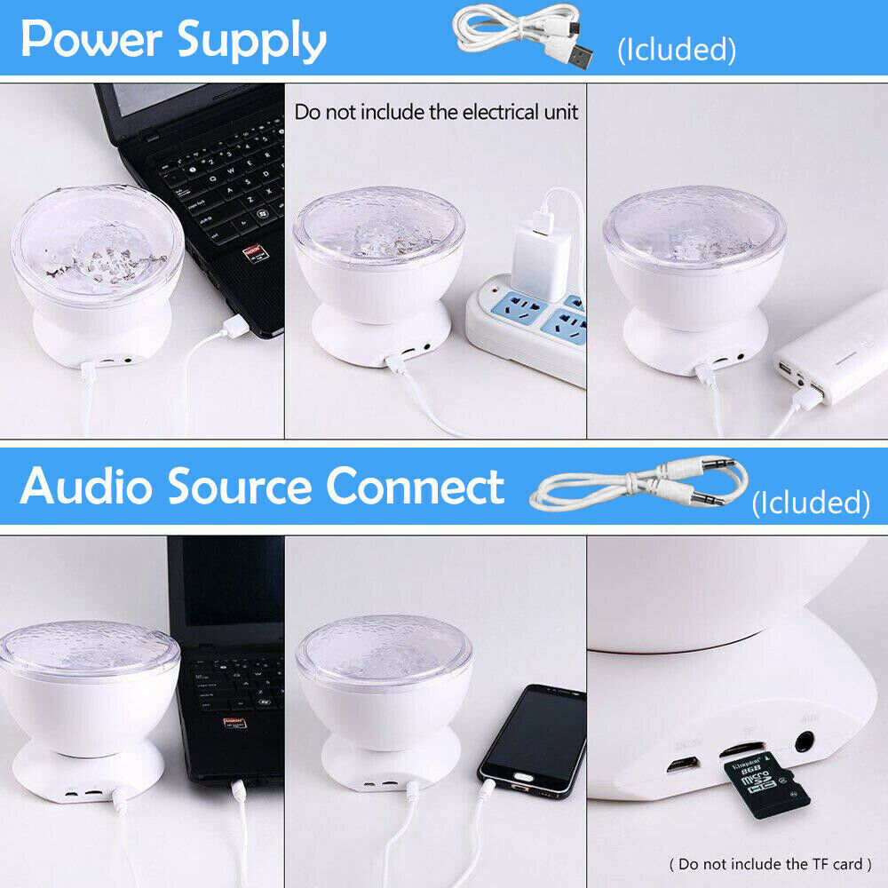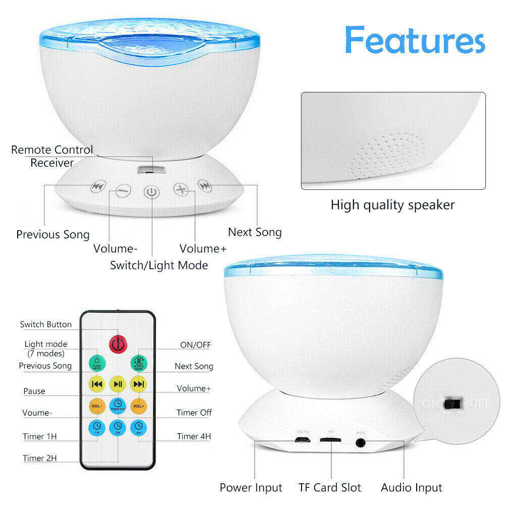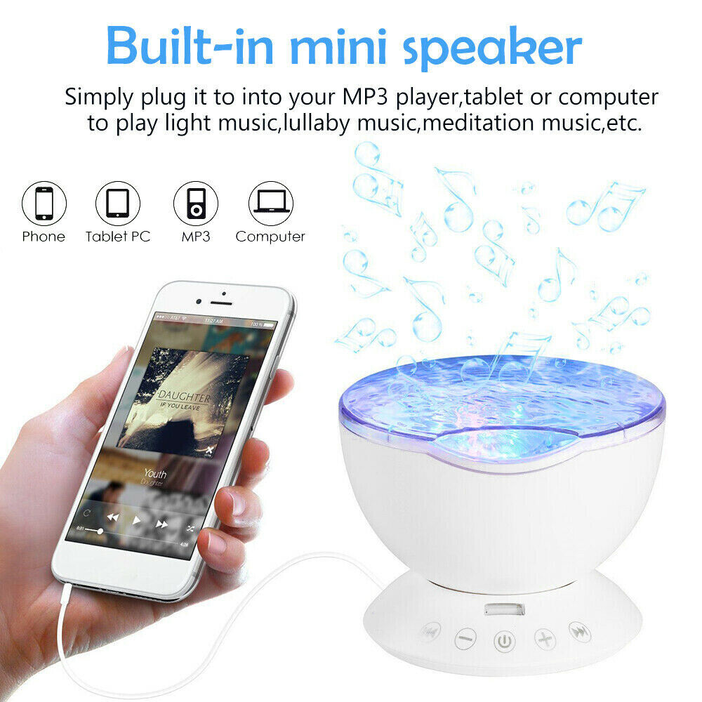 The ocean wave night light projector has built-in speaker so you can insert TF card to play music or connect it to your iPod, MP3, laptop, cellphone and so on via the included 3.5mm audio cable. Enjoy your preferred music in the pleasant atmosphere.