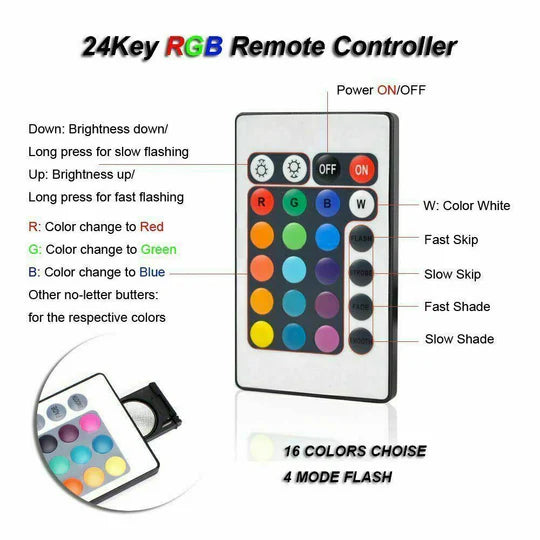 8.Come with a 24Key remote controller. The controller include offers 16 colors/ fading/ dimming,etc..,which creat a beautiful effect in the aquarium.