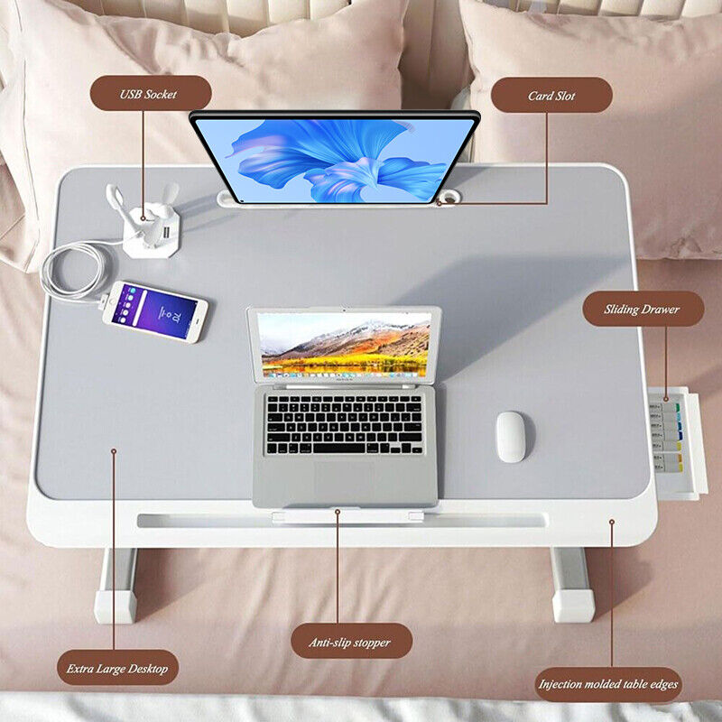 - Multifunctional Design: This laptop desk goes beyond the basics, offering a range of features to streamline your work or study. It includes drawers for small item storage, a USB charging port, and a tablet slot. With four USB charging ports, you can conveniently charge your phone, tablet, USB fan, and USB light, all while staying productive.