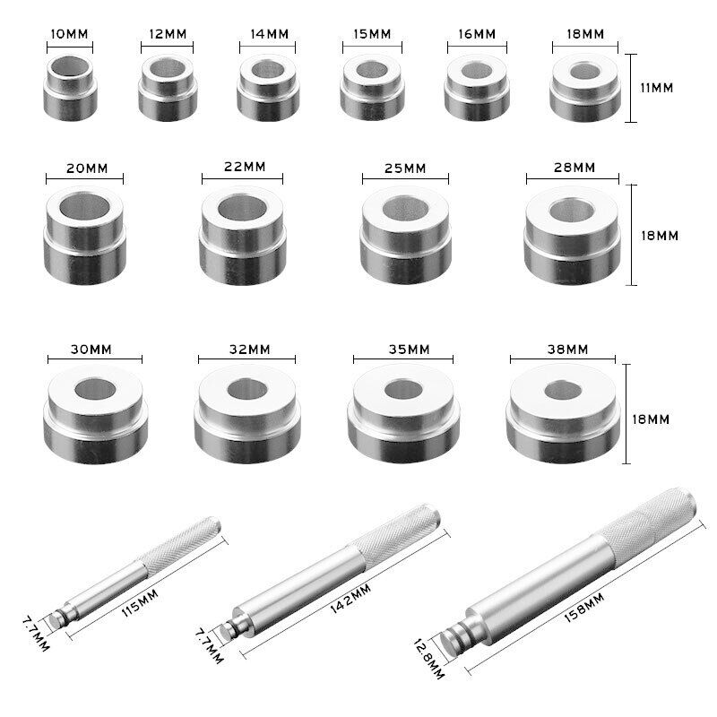 - 14 * Adapters(Internal Diameter - External Diameter): 10-12mm, 12-14mm, 14-16mm, 15-17mm, 16-18mm, 18-20mm, 20-22mm, 22-24mm, 25-27mm, 28-30mm, 30-34mm, 32-36mm, 35-40mm, 38-42mm